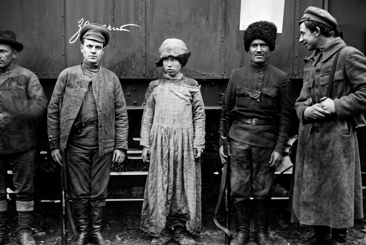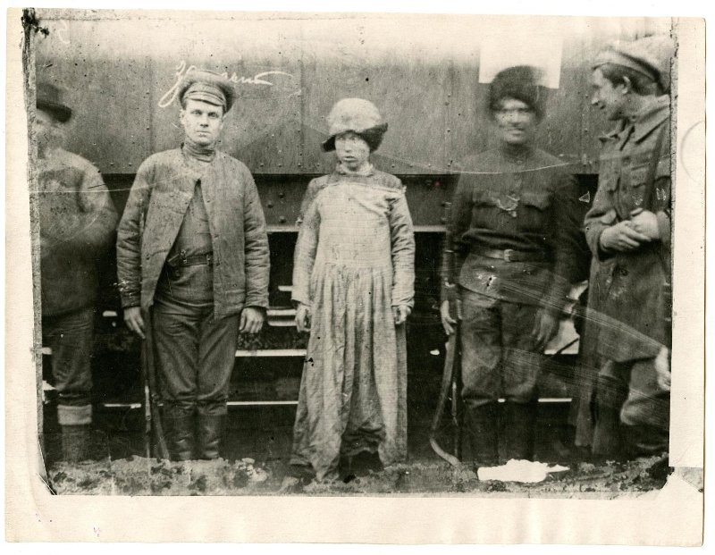 Я написал в музей и узнал у Льва Геннадьевича Ощепкова, ведущего научного сотрудника музея, некоторые сведения о данном музейном экспонате: "Уважаемый Виктор Иванович, вы совершенно правы, фотография обрезана, но есть более полный вариант, где присутствует конвой. Обстоятельства снимка: рота получила приказ атаковать противника, один из бойцов скрылся и переоделся в женское платье, но сбежать далеко не успел. Атака, видимо, была неудачной, т.к. бойцы вернулись назад, и один из них случайно встретил дезертира и опознал. Его арестовали и привели к штабному вагону. Имена участников и дальнейший ход дела неизвестны. Фотография находится в фонде документально-письменных источников музея и состоит на научно-ведомственном учете (НВ). Ее учетный номер НВ 192/65. Время и источник поступления неизвестны.